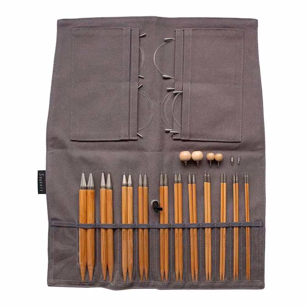 - Levereras i en grå tygväska (Seeknit Case 2) som viks ihop och hålls ihop med ett elastiskt band. Har avlånga fickor till stickorna och lite större fickor till kablar och tillbehör. Väskan blir 14,5 cm x 18,5 cm när den är stängd.