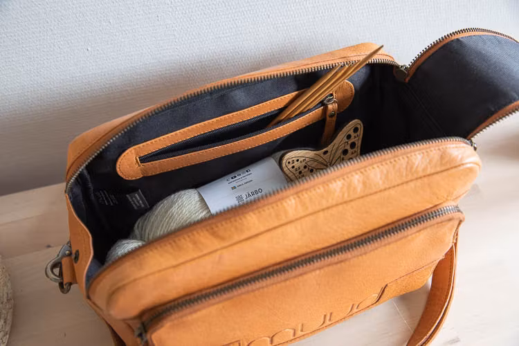 En snygg väska i äkta läder som också passar bra som projektväska. Väskan har en justerbar axelrem så att man kan bära den över axeln och den stängs med dragkedjor och knapp. Det finns fickor på både fram- och baksidan, och en ficka och flera fack på insidan, perfekt för att få ordning på stickor, virknålar, saxar, nålar eller allt annat man gärna vill få med i väskan.