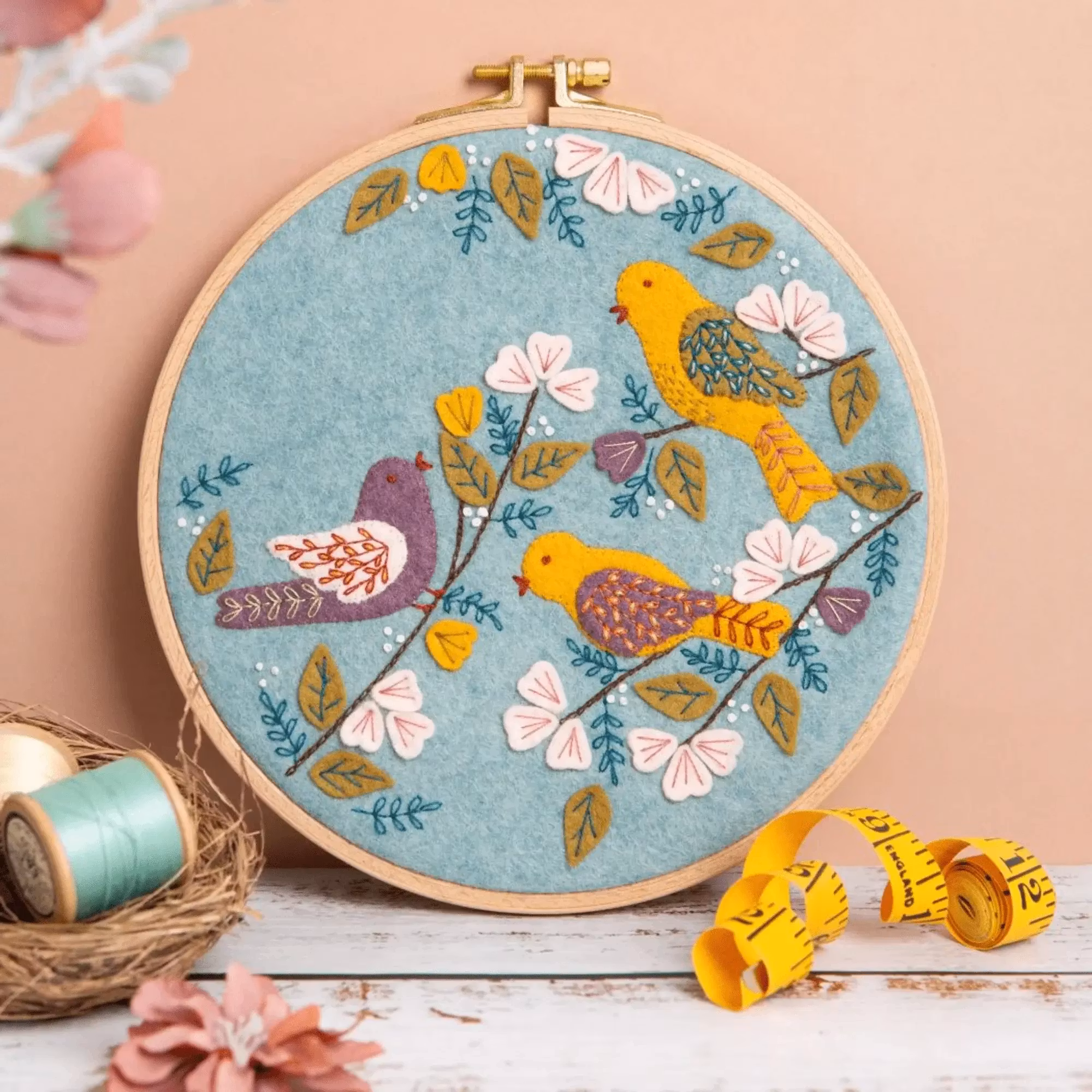 Ett komplett kit för att sy och brodera en tavla med fåglar i ett blommande träd i filt.